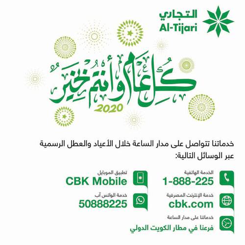 وبهذه المناسبة، ينتهز البنك التجاري الكويتي هذه الفرصة لكي يتقدم للجمهور بأطيب التهاني، متمنياً أن يحمل العام الميلادي الجديد 2020 كل السعادة والنجاح للجميع.